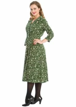The bodice is adorned with a collar and smooth buttons until the waist, while she closes with a zipper in the back. The flat pleats at the shoulders as well as above and underneath the waist make for a perfect 40’s look. The waist is accentuated by the removable belt, from where she flares into an elegant A-line skirt with pockets. She closes with a zipper in the back and falls below the knees for a height of 1,70 m.
