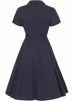 The beautiful quality cotton-mix has a very slight stretch and feels like a dream to wear. She closes on the front with the buttons to create a timeless shirt-look. The waist is accentuated by the belt, down from there she flares out into a full swing skirt which with a height of 1,70 reaches below the knee, and you can gorgeously combine with one of our petticoats to make those dots dance. She even has little pockets!