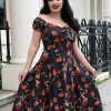 The waist is accentuated by the seam, from where she flares into a playful skirt that you can also wear with one of our petticoats. For a height of 1.70 m, she ends above the knees, and she closes with a zipper in the back.