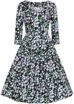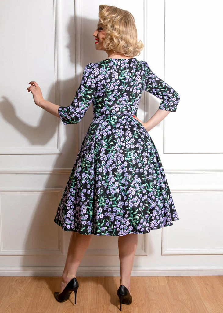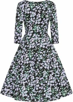 From just above the waist she flares into a full skirt with pockets, that you can of course wear with one of our petticoats the make the flowers blossom. For a height of 1.70 m, she ends below the knees and she closes with a side zipper.