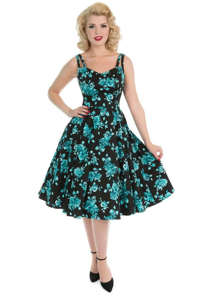 The bodice is nice and form fitting and from just down above the waist she flows into a full skirt, which is ofcourse lovely to wear along with one of our petticoats for a festive effect. She even has pockets!