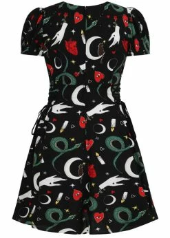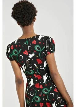 Snakes, fortune teller’s hands and black cats, they’re all there on a background of black viscose. There are seams running from the v-neck underneath or over the chest, for a classic vintage look. The short sleeves are playfully puffy thanks to the gatherings at the shoulders.