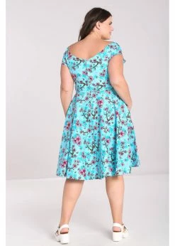 With her fresh print, wide neckline and cap sleeves, she could have come right out of the 50’s.