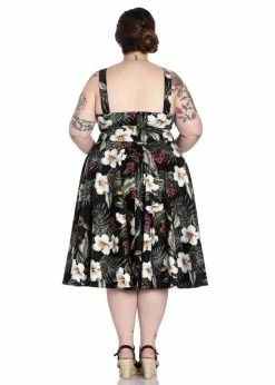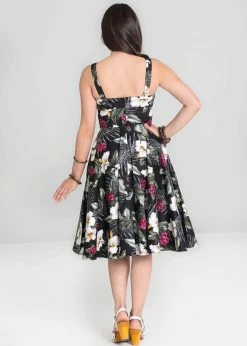 You can’t help but imagine you’re in tropical places because of the breathtaking orchids… This exotic cutie is made of an airy cotton-mix with a slight stretch which feels just as nice to wear as she looks. The bodice has a beautiful fit because of the seams. From just above the waist she flares out into a full skirt with pockets which you can gorgeously combine with one of our petticoats to make Tahiti come to life.