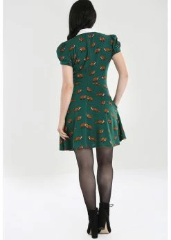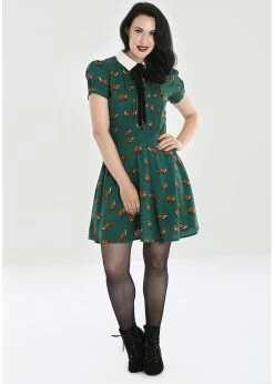 The little white collar and the black velvet bow make her look even more playful. Her decorative pleats across the front add a beautifull fit and because of her 100% viscose material she’s lovely and airy. From the waist down she flares out into a playful skirt which with a height of 1,70 reaches above the knee and closes with a zipper on the back.