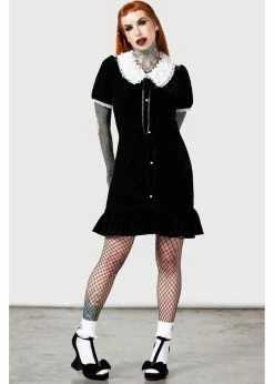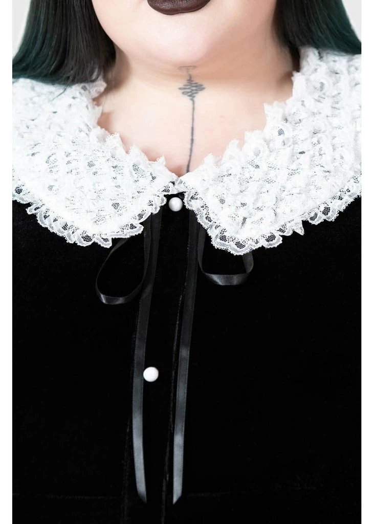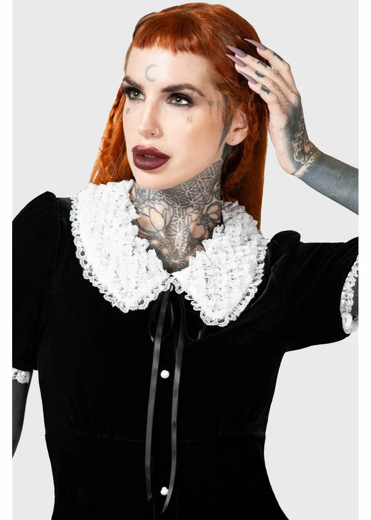 The blacker-than-black velvet is incredibly soft and has fine stretch, which makes her a dream to wear. The countless white ruffles on the collar seem innocent, which also comes back on the short puffy sleeves.