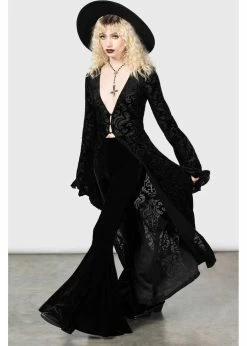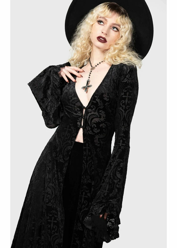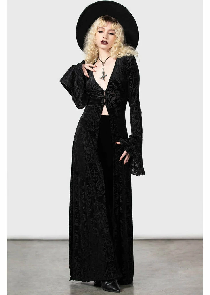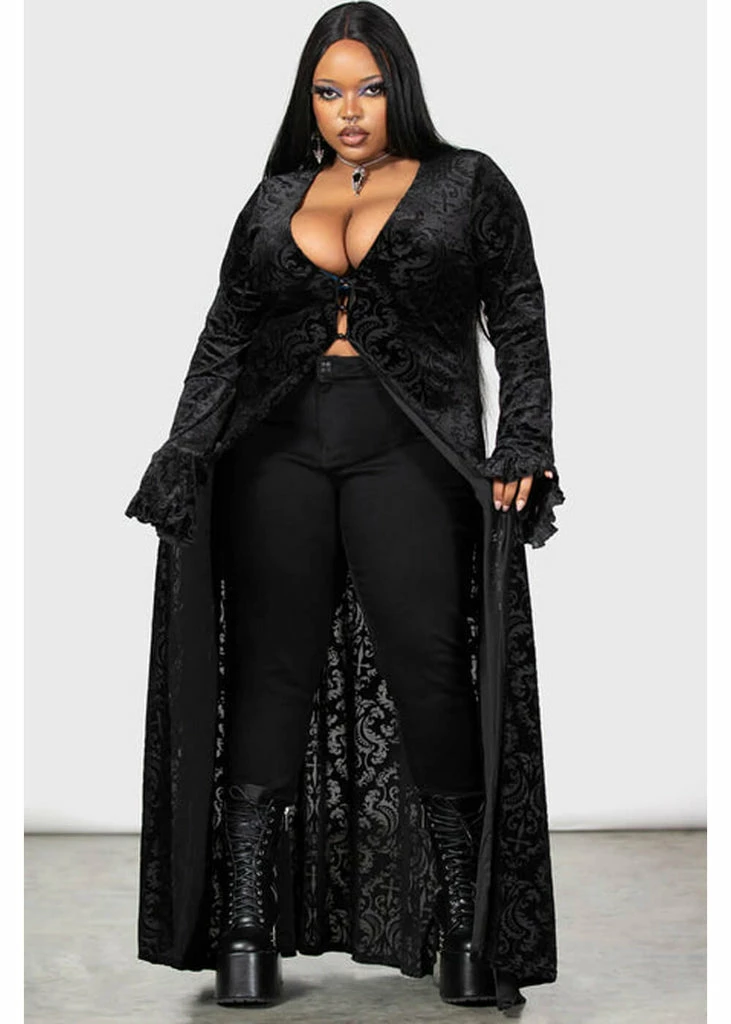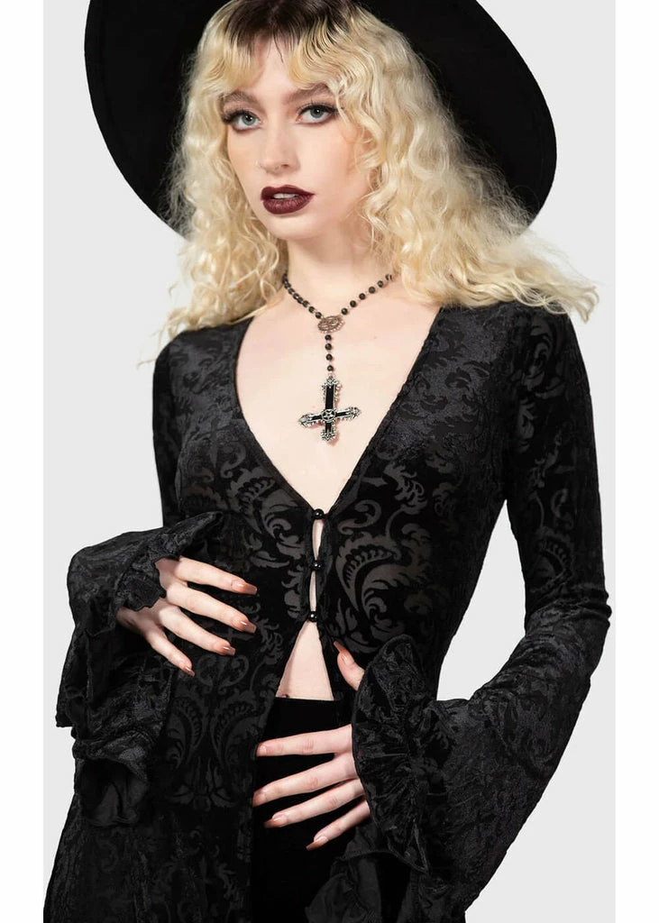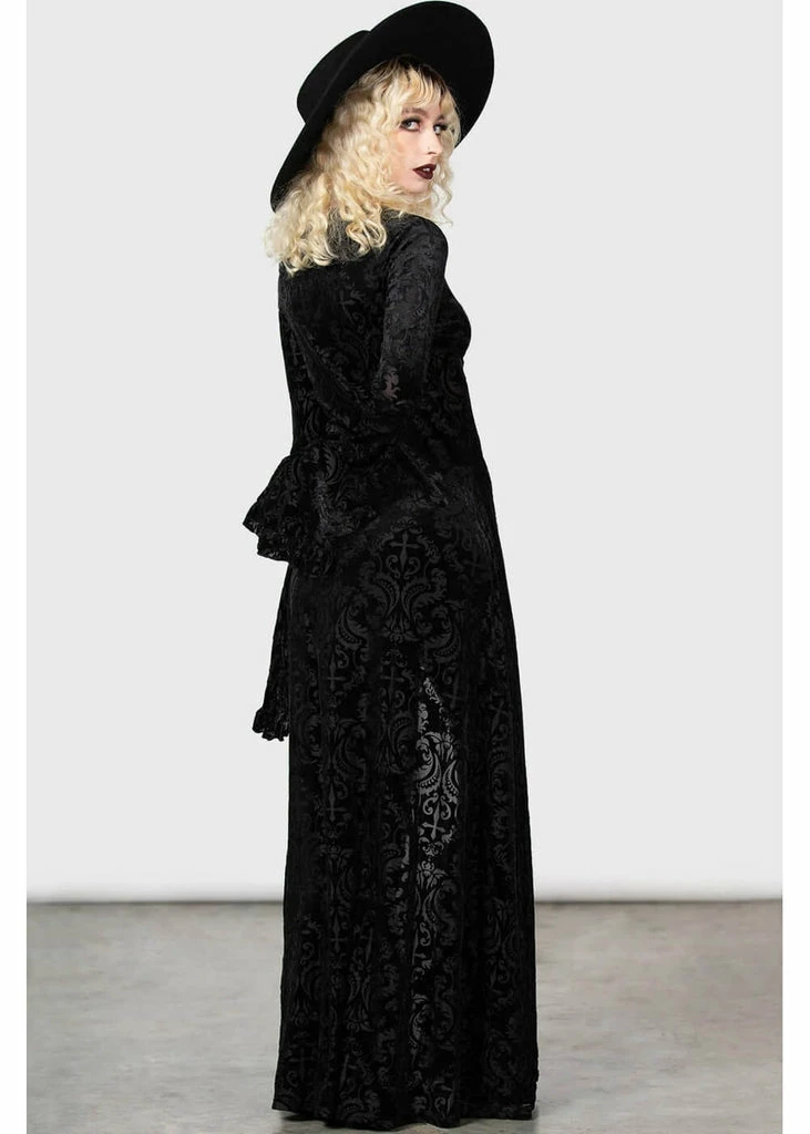 Woes Night takes your look to new heights, with her breathtaking burnout-velvet with stretch, that is semi-transparent around the occult velvet print.