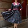 The waist is accentuated with the removable belt, before she flares from inverted pleats into a full skirt with pockets. Stunning with one of our petticoats, but she’s just as gorgeous by herself. For a height of 1.70m, she ends below the knees and she closes with a zipper on the side.