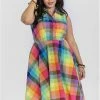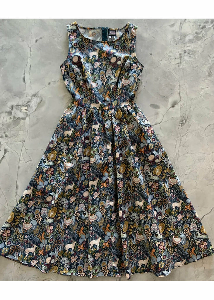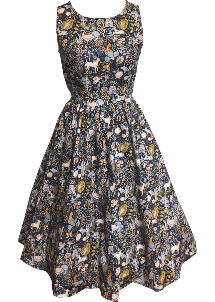 The model is precious, too, with the high round neckline and back. The waist is accentuated by the waist seam, from where she flares into an elegant skirt with pockets, that ends below the knees for a height of 1,70 m. For even more happy vibes, you can wear her with one of our petticoats. She closes with a zipper in the back, the belt does not come with the dress.
