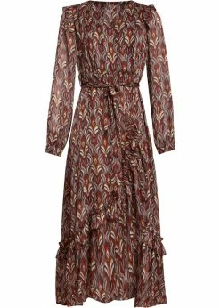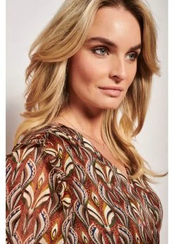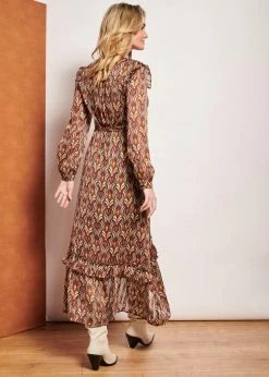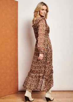 She’s a true retro-gem with her earthy colours and lurex that gives her a subtle gloss. And then the model, wow… She has an enticing v-neck, that you can see best in the pictures with the model, because the lining of the upper back has the same pattern. She flares into an elegant skirt that falls almost to your ankles for a height of 1.70m and she closes with a zipper on the side.
