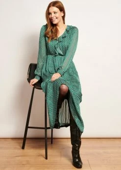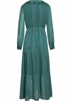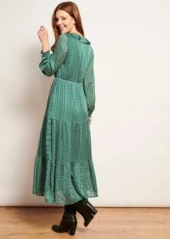 At a vintage teaparty or out for a cocktail, you’ll impress with this beauty! The lovely pattern literally shimmers thanks to the subtle lurex-threads. The puffy sleeves and the v-necka re adorned with ruffled edges.