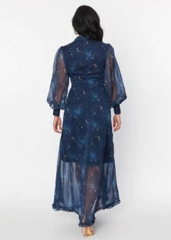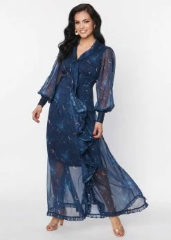 You feel like a true goddess in this beauty, with her long puffy sleeves, scarf detail and ruffled edges along the skirt! Her smooth chiffon without stretch sways along with every step, making the stars seem to fly…