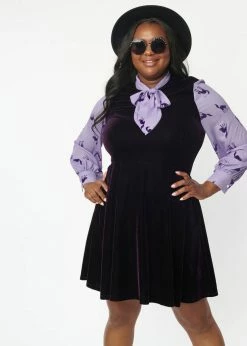 Which one is your favourite detail: the stylish 40’s inspired sleeves made of crepe, slightly puffy with cuffs and adorned with Scaredy Cats, or the extraordinairily elegant pussybow? To make it even harder, the dress itself is made of a breathtaking stretchy dark purple velvet, such luxury!