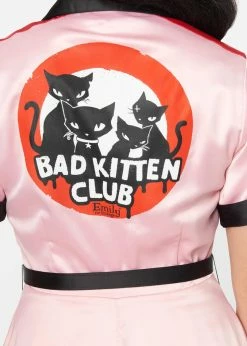 At the bowling alley or a Rock ‘n Roll party, this retro shirt dress is a strike! This satin-look cutie with fine stretch is too sweet for words with her pink colour, with feisty details like the black kitty peeping out from above the chest pocket. The back is adorned with your new favourite club, too: the Bad Kitten Club 😉